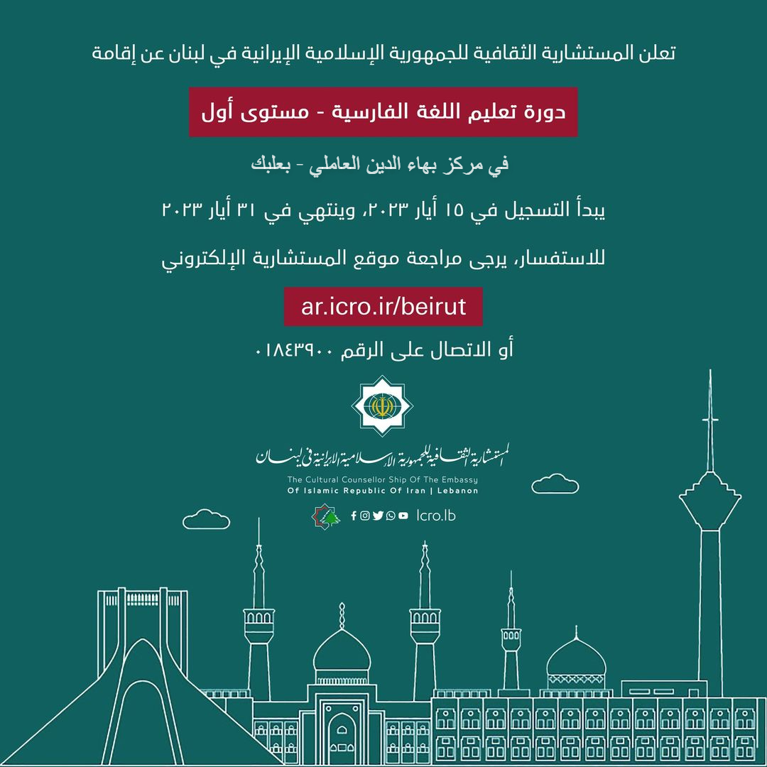 تعلن المستشارية الثقافية للجمهورية الإسلامية في لبنان عن إقامة دورة تعليم اللغة الفارسية - مستوى أول في مركز بهاء الدين العاملي (بعلبك - الشيخ حبيب).