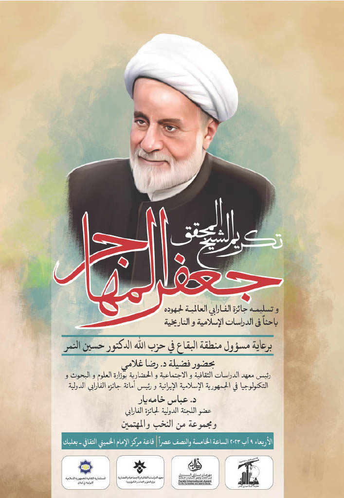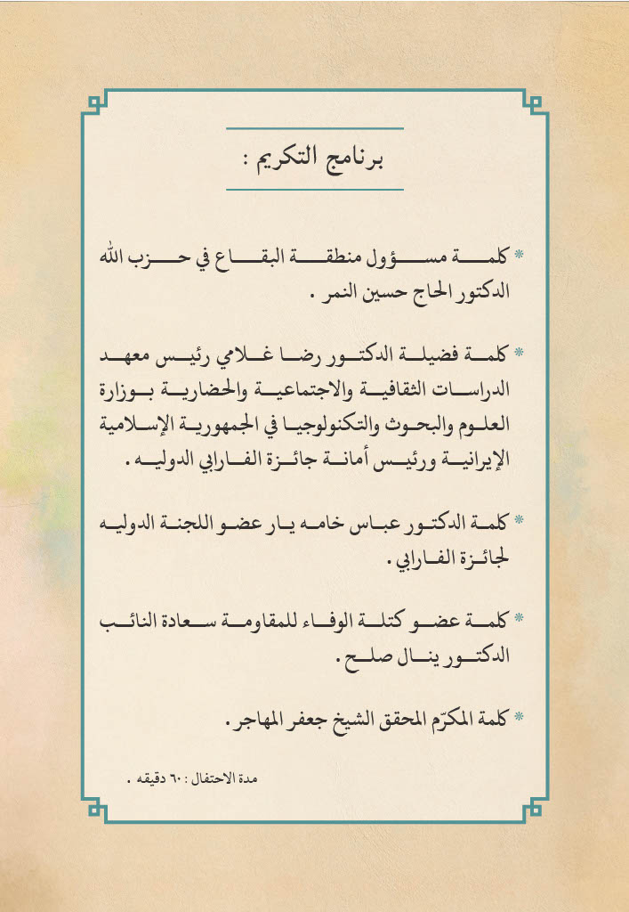 كما يقام حفل تكريمي لسماحة الشيخ د. جعفر المهاجر لاستلامه جائزة الفارابي العالمية في بيروت (الإعلان السابق).